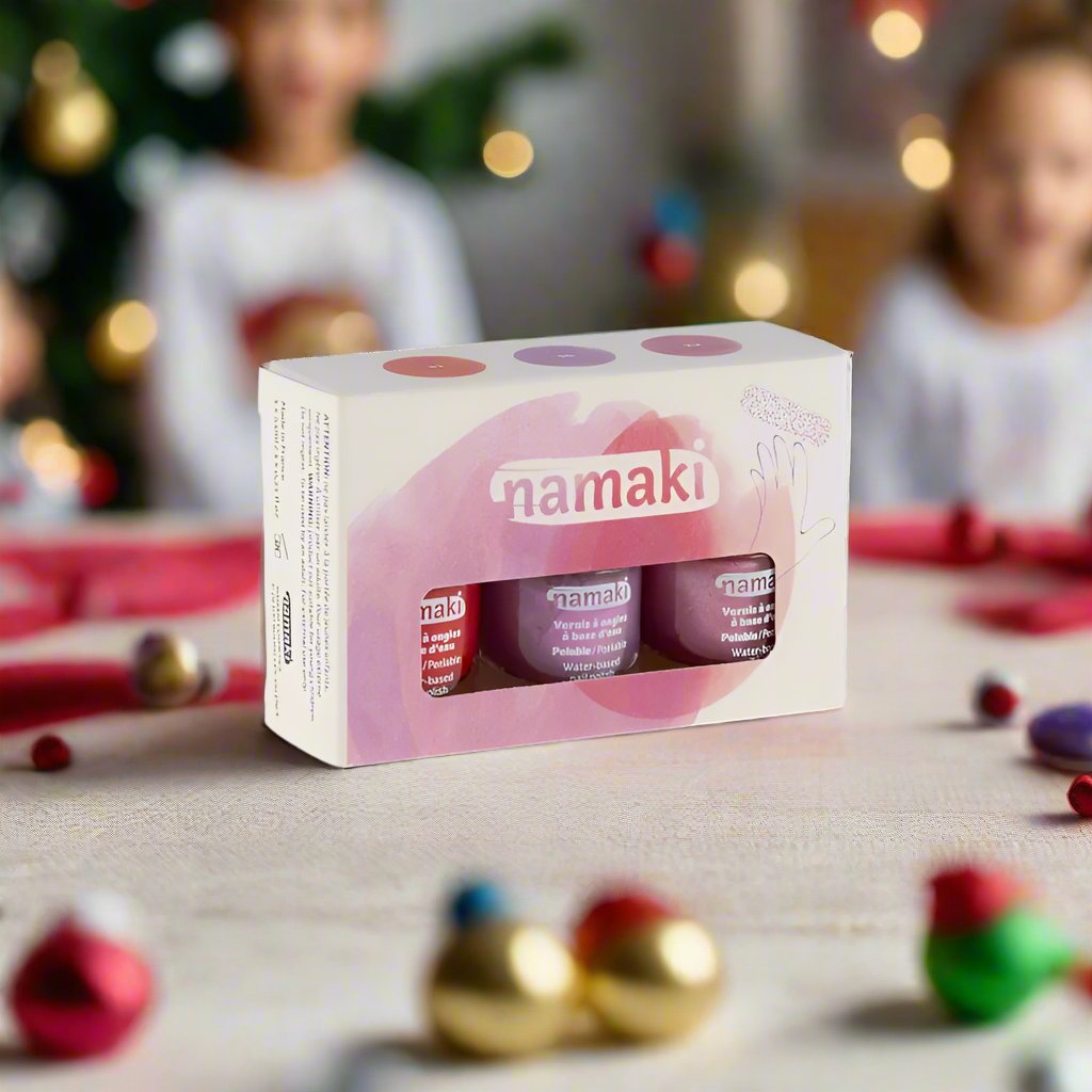 The Namaki “Eternal Roses” water-based nail polish set in shades of Morello Cherry, Mauve and Bright Pink takes us to a secret garden where roses never fade.